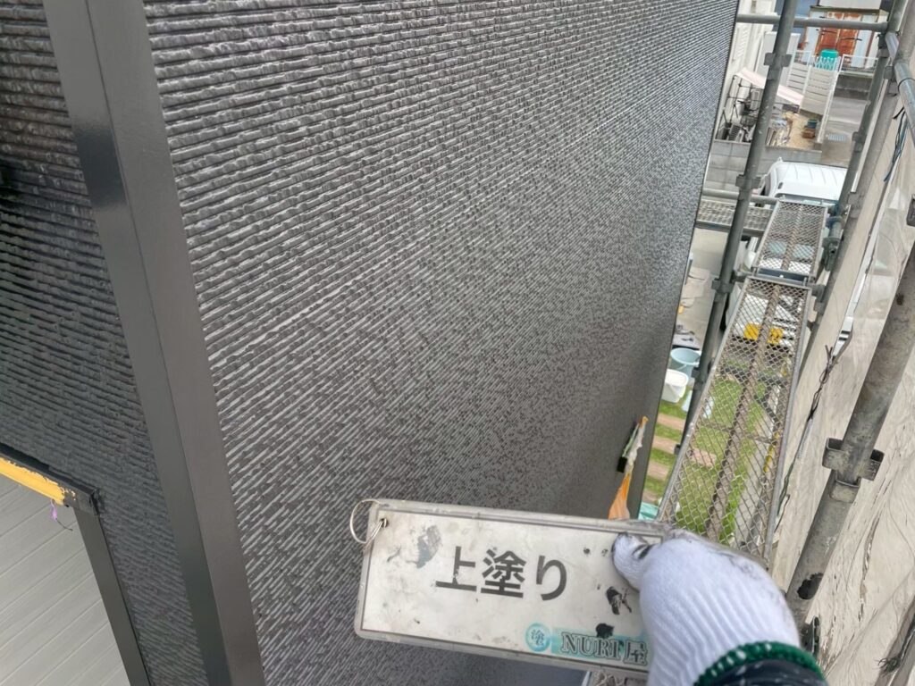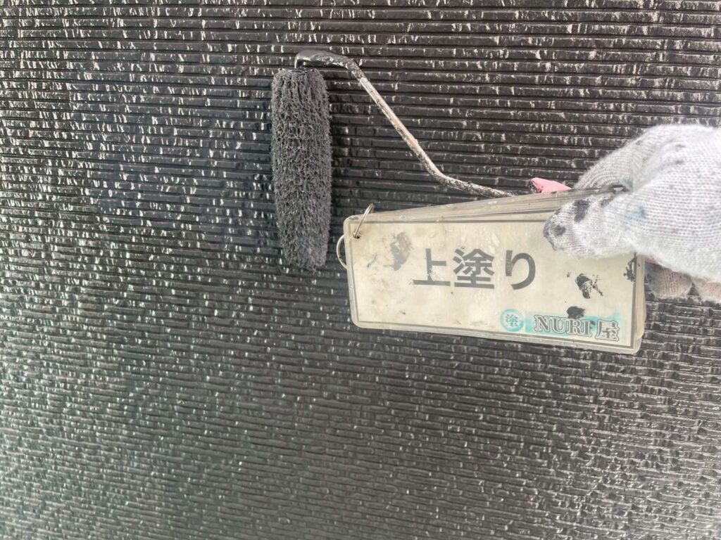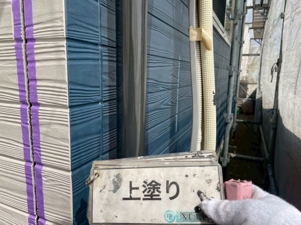 上塗りは、外壁塗装の最終工程で建物の美観と耐久性を高める役割があります。下塗り、中塗りの後に行い、中塗りの塗りムラをなくして均一に仕上げると同時に、紫外線や雨風から建物を保護し、塗料の持つ性能(遮熱性、防汚性、防水性など※備えている機能性は塗料によって異なります)を最大限に引き出します。最終的な色ツヤは上塗りによって決まります!